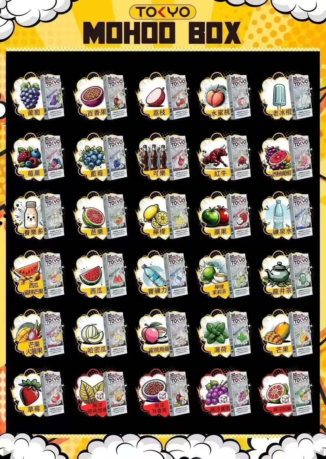 為了迎合不同使用習慣,東京魔盒 MOHOO 同時推出兩種版本。喜歡清爽用戶可以選擇版,不喜歡冰涼口感可以選擇版本。除了傳統煙草之外,系列加入多種水果風味,口感更加自然柔和。